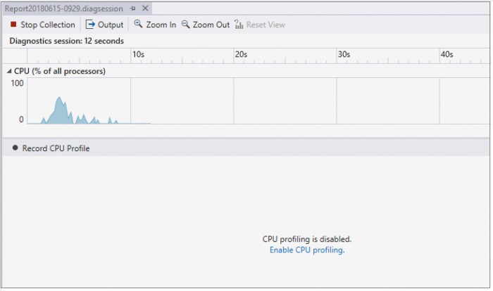 \*启动目标应用程序后(按性能探查器启动页中的“开始”按钮),将看到一个显示 CPU 使用率图的监视屏幕,你可通过它控制 CPU 分析**。 要启用 CPU 使用情况示例堆栈数据收集功能,请按视图中间的“启用 CPU 分析”链接,或单击 CPU 使用率图下方的“记录 CPU 配置文件”按钮。 可单击“记录 CPU 配置文件”按钮,根据需要多次启用/禁用示例数据收集。 CPU 使用率图的颜色出现相应变化,表示在该时间点是否启用/禁用示例收集。