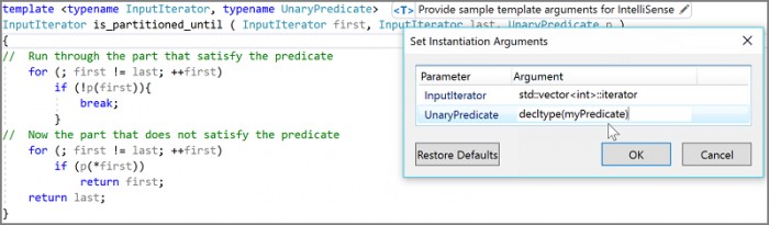 用于模板的 IntelliSense 提供了有关模板参数的详细信息,便于在模板正文中充分利用 IntelliSense。