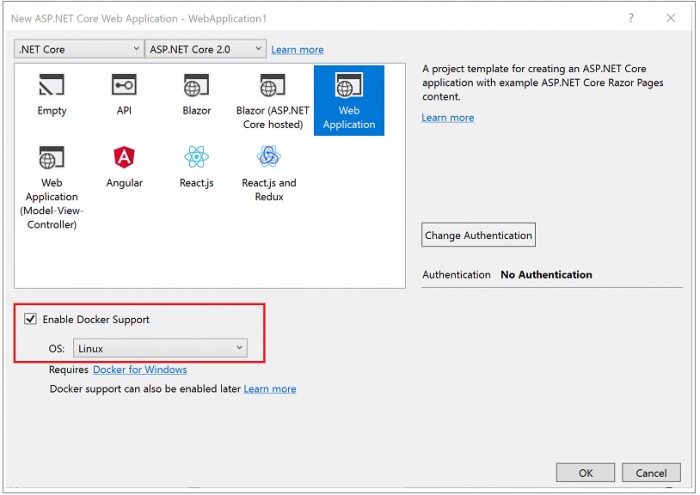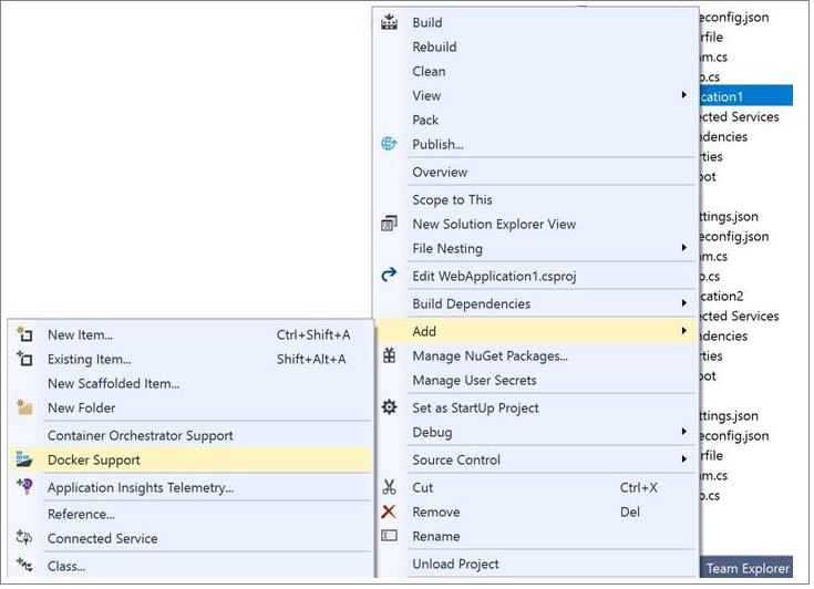 或者,可以通过解决方案资源管理器中项目的上下文菜单对现有项目启用 Docker 支持。 一旦执行此操作,Visual Studio 将在项目中创建单个 Dockerfile。 可以选择 Windows 还是 Linux。