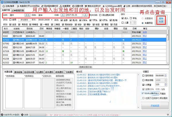 3、成功登陆后,直接输入出发地、目的地、以及出发时间,点查询车票,如图所示: