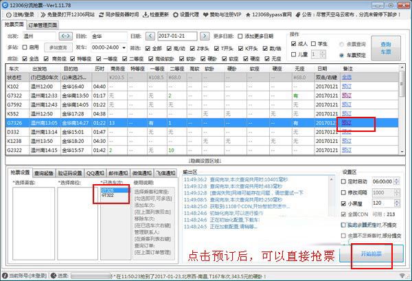 4、再点击你要预订的车票,直接开始抢票即可,如图所示: