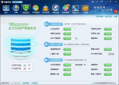 16层即时安全防护,维护您网上和下载时的安全性、预防病毒根据U盘侵入您的电脑、从操作系统最底层全面防御病毒攻击。的全新检索维护,安全上网给予通道级安全防护,在你检索、网页浏览、下载、闲聊、网上购物、网络游戏时,都全过程保驾护航,安全防范不留死角。