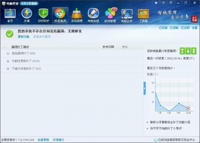 通过电脑管家修复更新系统中存在的“高危漏洞”“功能性更新”,并给出可安装可不安装的“不建议安装的补丁”提示!