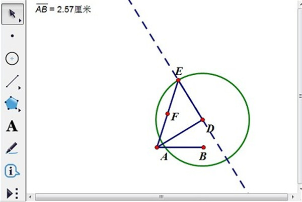 2、在B附近构造点D,构造线段AD。过点D构造线段AD的垂线。选定点D和线段AB的长度度量值,“构造”——“以圆心和半径绘圆”,得到圆与垂线的交点E,构造线段AE和DE。选定线段AE,构造中点F,如WinWin7小编给大家分享的图片: