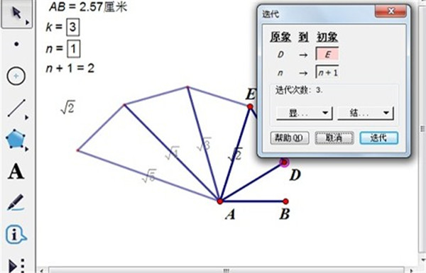 4、选定“根号n+1公式”和点F,按住shift键,点击“编辑”——“合并文本到点”。隐藏点 F、圆和垂线,依次选定点 D(原象)、参数 n(原象)和参数 k(迭代深度),按住shift键,“变换”——“深度迭代”。依次点击点E、n+1,在“结构”中取消生成数据表,最后点击“迭代”按钮,如WinWin7小编给大家分享的图片: