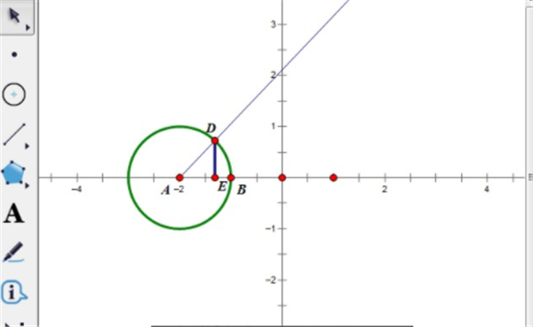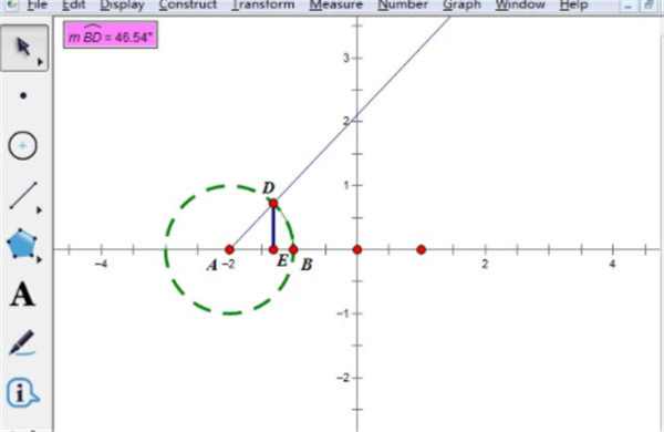 步骤三 在单位圆上取一点D,按顺序选中A、D,在菜单栏里“构造”→“射线”,构造一条射线,过点D构造x轴的垂线交x轴于E,隐藏垂线,再构造线段DE,并在菜单里“显示”把线段DE改成蓝色、粗线,如WinWin7小编给大家分享的图片:
