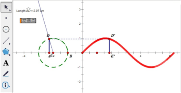 步骤八 选中点D,点“编辑”→“操作类按钮”→“动画”,点击“确定”按钮,然后点击动画点按钮,即可演示正弦函数图像,如WinWin7小编给大家分享的图片: