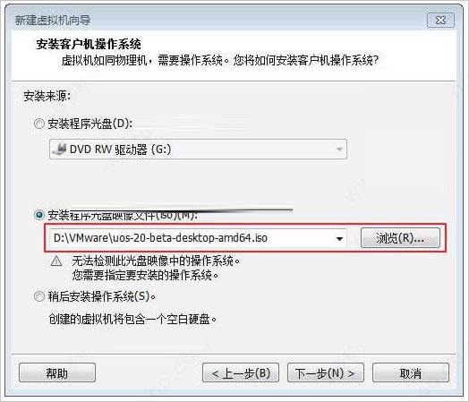3、安装来源选择 UOS 光盘映像文件,单击“下一步”;