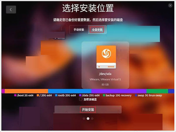 10、单击“继续安装”,选择”全盘安装“,单击“开始安装”;