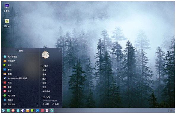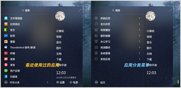 开始菜单使用了类似Win7设计,半透明的“毛玻璃”很酷,再配合全彩的图标设计,给人以完全不同于Windows的感觉。打开后首先显示的是最近用过的应用,下方则是全部应用。和Windows不同的是,UOS已经默认给应用分好组了,看上去非常整齐。