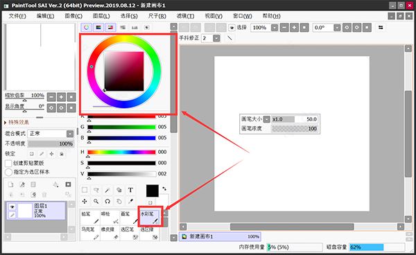 步骤六:选择水彩笔,如下图,对画图区域进行处理(选择R值为红值,选择红色);