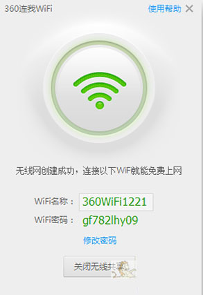 在360连我wifi界面点击“修改密码”可以修改当前WIFI密码,输入新密码后点击“确定”按钮即可。点击右上角“╳”可将连我wifi界面隐藏,此时其仍在后台运行,您只管使用手机尽情上网就行啦~若您想关闭wifi共享,只需点击连我wifi界面中的“关闭无线共享”按钮即可。
