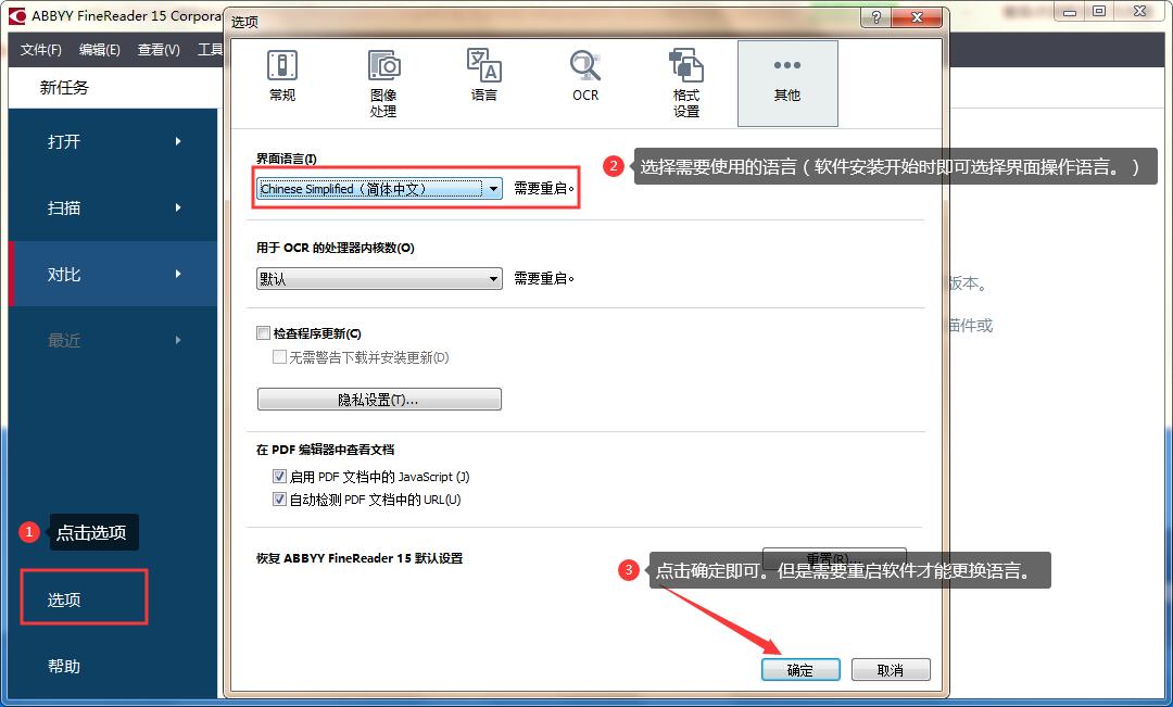点击“选项”--“其他”--“界面语言”选择需要的语言即可。PS:语言设置完成后,需要重启软件界面语言才会生效。如图