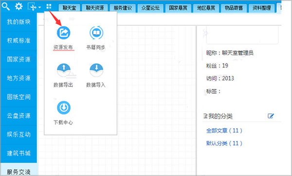 包括国家规范、国标图集、施工验收、注册考试、行业标准、地方法规、地区图集、省标图集、法规公告、图纸空间、云盘资源、专家答疑、建筑书城、商城等;专业分类包含建筑、结构、给排水、采暖通风、电气、消防、规划园林、道路桥梁、工程监理、工程造价、室内装饰、房地产、效果渲染、建筑风水、BIM、图纸等。