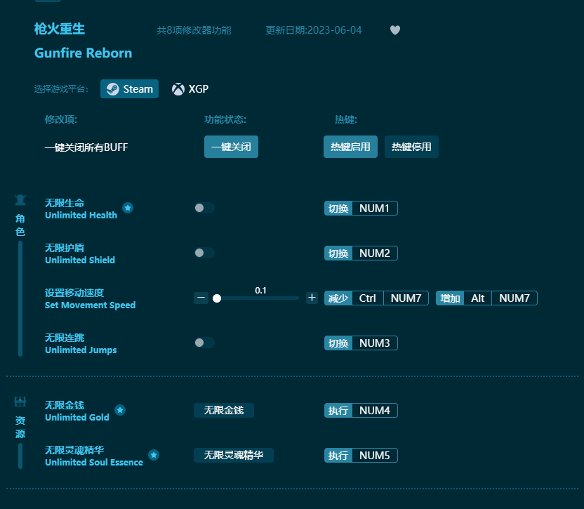 枪火重生修改器为广大玩家提供了全能修改功能,包括了可以让你不死的无限生命、抵挡伤害的无限护盾、改变移动速度、可以超级跳、无限金钱等等,是难能可贵的一款游戏修改器。
