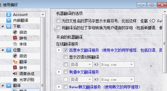 这里的翻译选项先只选择百度中文翻译,其余翻译全部关闭,翻译越多程序越卡。然后语音合成选择关闭。