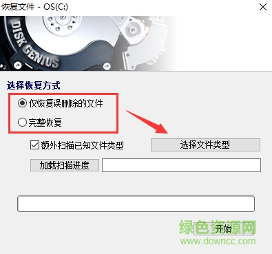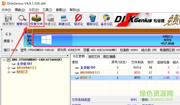 1.首先diskgenius,选择需要恢复数据的系统盘,然后,上方的“点击恢复”按钮,见winwin7分享的图片所示: