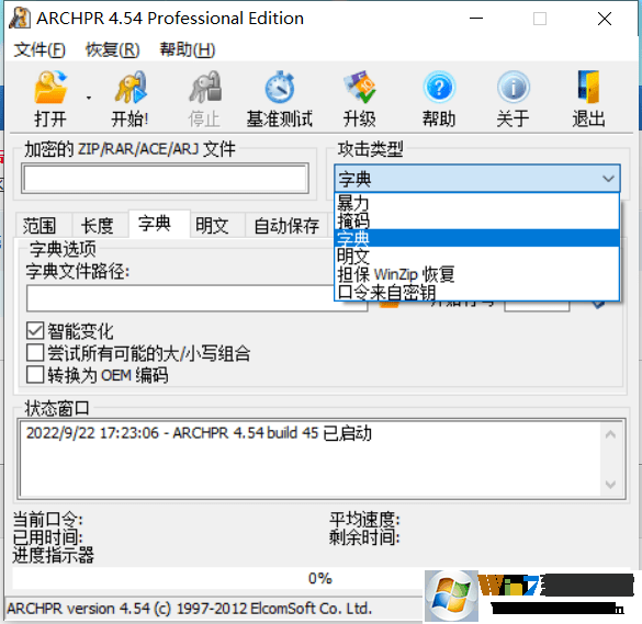 在软件内可以设置攻击类型为暴力破解还是字典破解