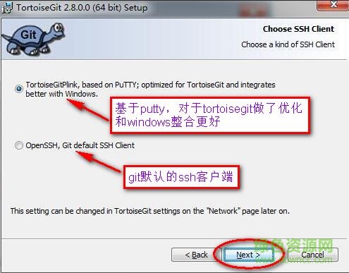 5.这里选openssh(git默认的shh客户端,位于git安装目录/bin/ssh.exe;如果配置了path,那直接是ssh.exe)和tortoisegitplink(位于tortoisegit安装目录/bin下)都可以,我们这里默认第一个,继续“next”