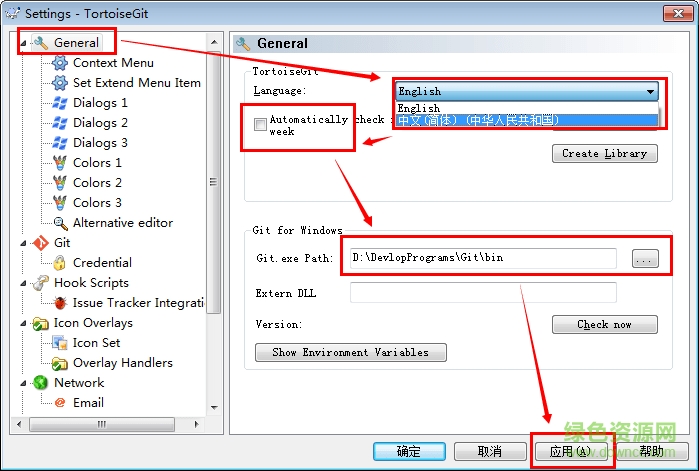 3.点击左边侧栏中的“general”,在右边的“language”中选择“中文(简体)”,并去掉“automatically check week”前面的勾;点击“git.exe path”指定git.exe文件的路径,如“d:\devlopprograms\git\bin”,设置完成后,点击“应用”。