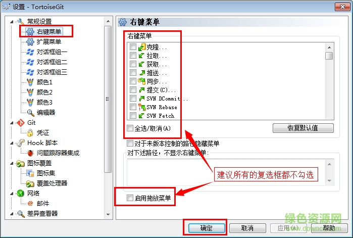 4.上面操作完成后,我们再次鼠标右键,可以看到菜单已经变成中文了,“settings”变成了“设置”,“slone”变成了“克隆”;再次打开配置菜单,选择“右键菜单”,去掉所有的勾选(如图),点击“确定”