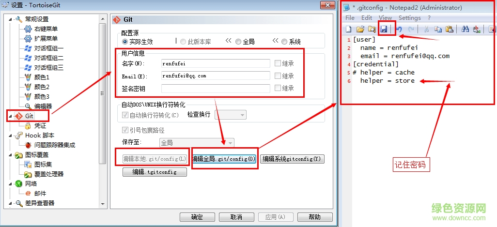 点击 “编辑全局 .git/config(o)”按钮,会使用记事本打开全局配置文件,在全局配置文件中,在后面加上下面的内容: