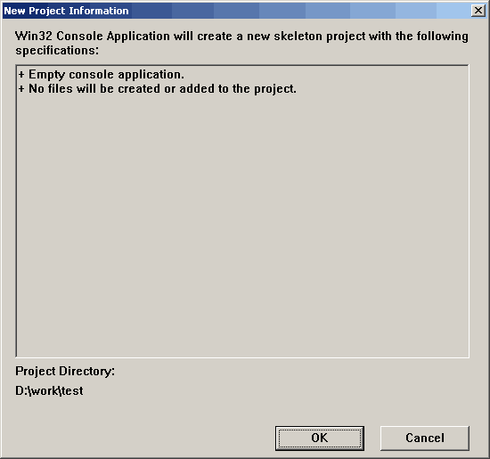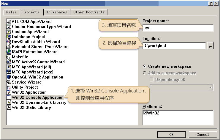 2. 在 projects 选项卡里选择 “Win32 Console Application” 类型的项目,并选择项目所在路径、填写项目名称,点 OK 继续: