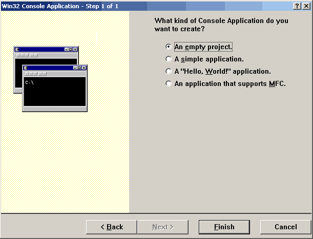 3. 选择 ”An empty project“ 创建一个空项目,稍后再添加代码文件。点击 Finish 完成: