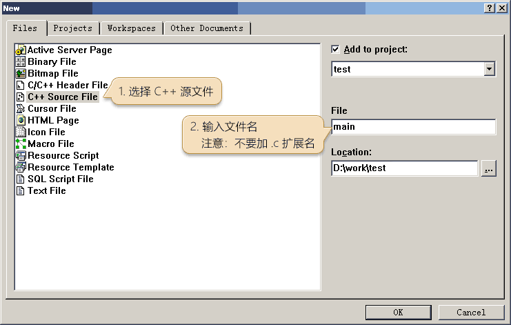 7. 在 Files 选项卡里选择 “C++ Source File”,然后填写文件名(注意不要加 .c 扩展名),点 OK 继续: