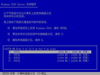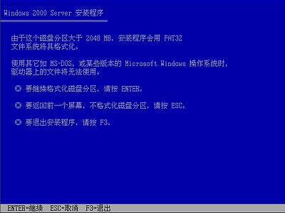 这里对所选分区可以进行格式化,从而转换文件系统格式,或保存现有文件系统,有多种选择的余地,但要注意的是NTFS格式可节约磁盘空间提高安全性和减小磁盘碎片但同时存在很多问题OS和98/Me下看不到NTFS格式的分区(这儿既然是Server,个人强烈推荐选择NTFS),在这里选“用FAT文件系统格式化磁盘分区”,按“Enter”键。