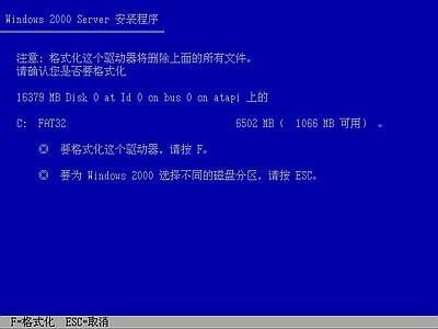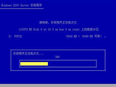 只有用光盘启动或安装启动软盘启动Windows 2000安装程序,才能在安装过程中提供格式化分区选项;如果用MS-DOS启动盘启动进入DOS下,运行i386winnt进行安装Windows 2000时,安装Windows 2000时没有格式化分区选项。格式化C分区完成后,安装程序开始从光盘中复制文件。