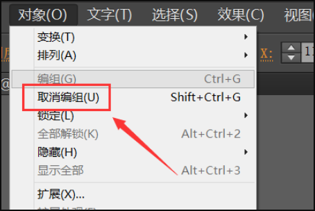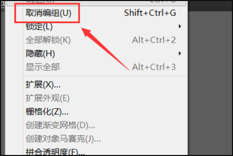 再在对象菜单里找到取消编组选项,此时可以看到该选项就被激活了。