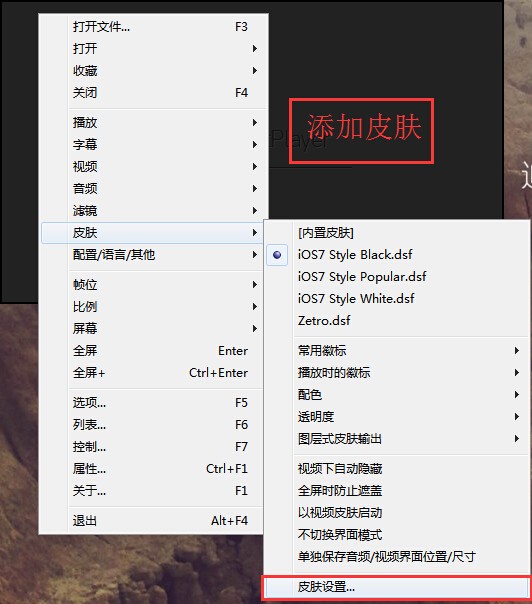 打开播放器,右键找到皮肤选项,点击皮肤设置,如winwin7分享的图片: