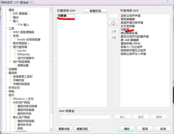 〓4.DSP管理的设置,dsp是数字信号的处理,我们可以理解为音效处理。新手建议使用均衡器就可以了,对于其他音效插件(dfx,BBE,重低音,杜比环绕以及各类音效)的使用,以后会在那些音效插件里讲到。
