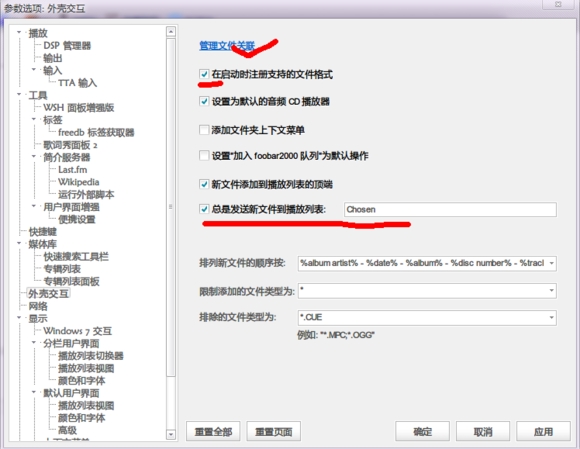 〓6.文件关联设置:文件关联是指将各格式的音乐文件(mp3,aac,flac,ape,cue,tak,wav,wma等)关联到你那个foobar上,就是双击音乐文件后是用那个foobar打开的,那个音乐文件也是foobar的关联图标(我会分享一些好看的关联图标)