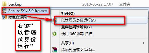3.打开注册机文件夹,此时确保360安全卫士一类的工具全部退出,然后右键“以管理员身份运行”SecureFX.v.8.0-kg.exe(ps:必须以管理员身份运行,不然会破解失败),如下图winwin7分享的图片: