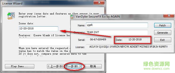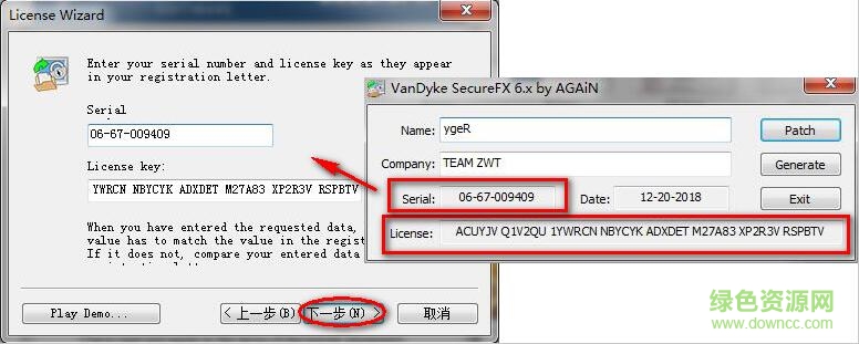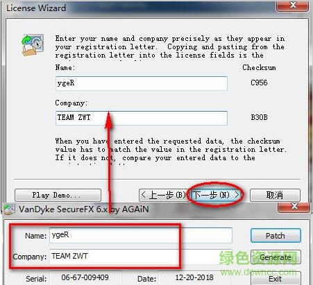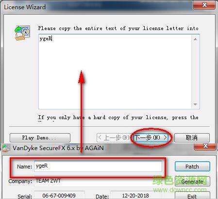 5.然后回到SecureFX(第2步的位置,不要关闭注册机),将注册机中的ygeR填入(如图),点击“下一步”,如下图winwin7分享的图片: