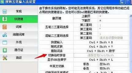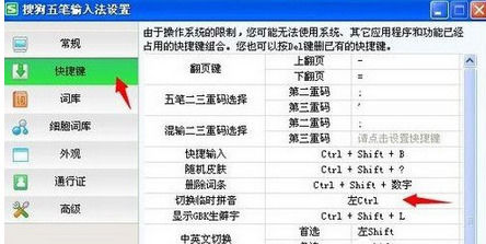 3、接着我们在搜狗五笔输入法设置对话框中,第二项是快捷键设置,这里有一个临时切换拼音的设置,其中的快捷键设置的是左Ctrl,所以只要按左Ctrl键就能切换到临时拼音;