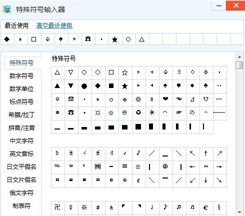 左侧标签选择种类,右侧滑轮下拉菜单。找到你想要的特输符号单击即可输入