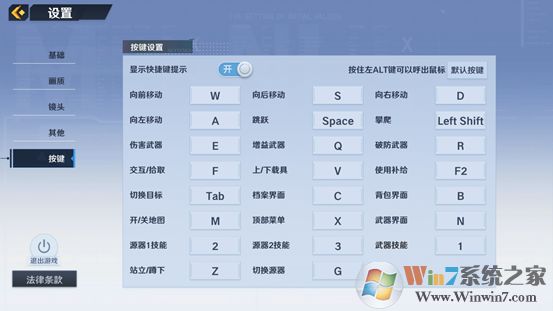 玩家方向键位是W(前)S(后)A(左)D(右)。攻击键(鼠标左键)、躲避按键(鼠标右键)、跳跃按键(空格键)、技能按键(字母上数字键)、切换主武器(E键)、副武器(R键)、喷射器(字母上数字2键)、AIt键可以呼出鼠标。