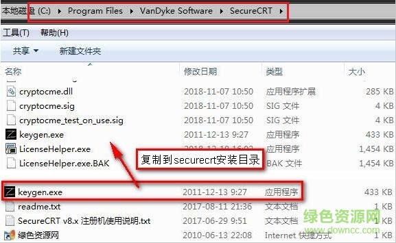 1.打开安装包中的“8.x 注册机”文件夹,将“keygen.exe”复制到securecrt安装目录(默认路径为:C:\Program Files\VanDyke Software\SecureCRT),如winwin7小编分享的图片所示: