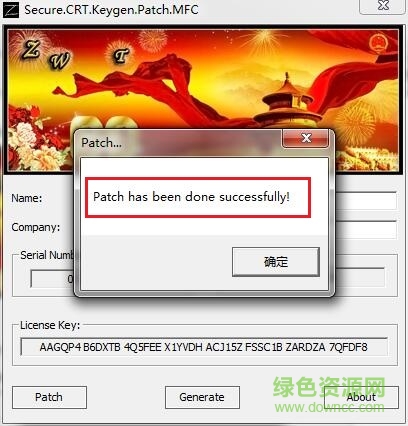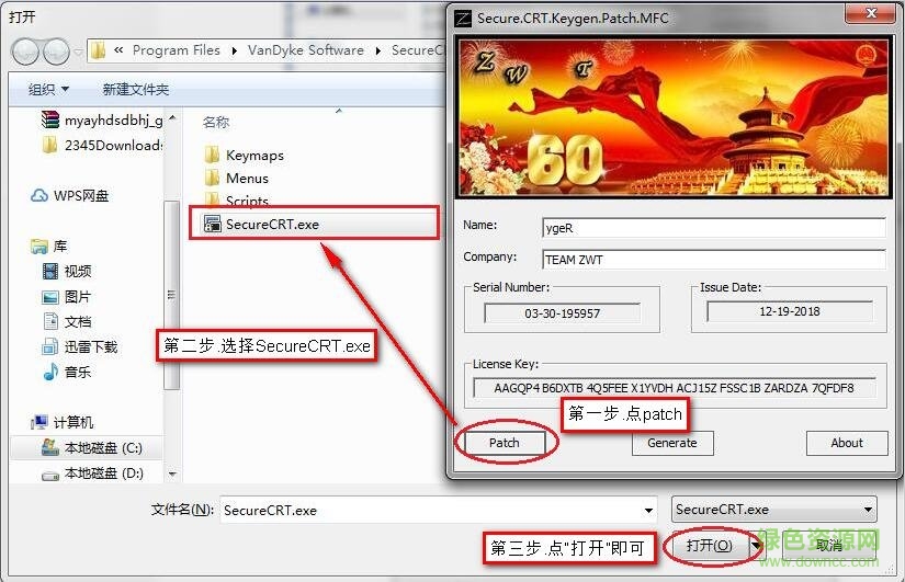 3.然后点击“patch”,选择“SecureCRT.exe”可执行文件,点击“打开”,会有“patch has been done successfully!”的提示(按下图进行操作),如winwin7小编分享的图片所示: