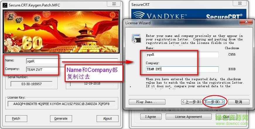 8.然后将注册机中的Name和Company信息都复制到软件框中,再点“下一步”,如winwin7小编分享的图片所示: