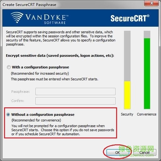 11.勾选“without a configuration passphrase”,点击“ok”就可以了,如winwin7小编分享的图片所示:
