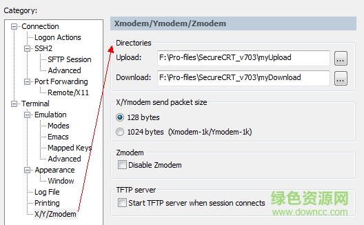 options->session options ->Terminal->Xmodem/Zmodem 下,在右栏Directories设置上传和下载的目录: