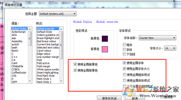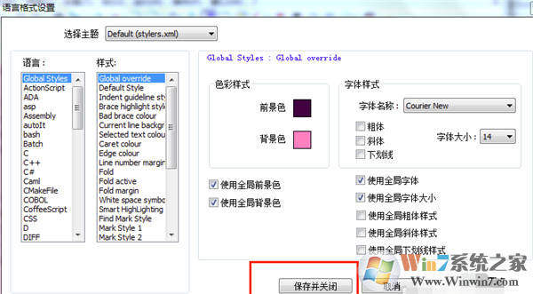 4、以上有关Notepad++更改字体大小及颜色的步骤已经设置好了。我们只需要单击【保存并关闭】按钮关闭该页面即可。