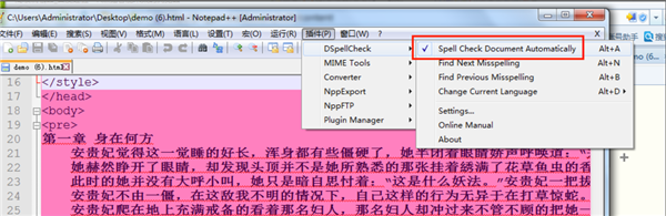 6、首先我们需要在图中找到【插件】选项,然后选择DSpellCheck并将Spell Check Document Automatically选项前的对钩去掉。