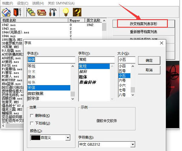 接下来可以看到小霸王模拟器界面右侧有“改变档案列表字形”选型,点击后就可以进入字体选项界面,如图所示,可以设置字体种类、字形、大小等选项,设置完成后进行下一 步;