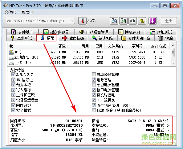 HD Tune Pro是一款小巧易用的硬盘工具软件,其主要功能有硬盘传输速率检测,健康状态检测,温度检测及磁盘表面扫描等。另外,还能检测出硬盘的固件版本、序列号、容量、缓存大小以及当前的Ultra DMA模式等。