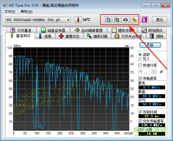 5.在HD Tune软件的顶部有复制测试结果工具,还有为文软件拍照的工具,HD Tune选项也是在这个位置